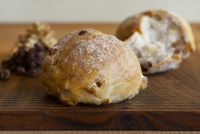 ロールパンで人気のレーズンとくるみの組み合わせ。バターを少し入れたシンプルな生地にローストくるみとラム酒漬けしたサルタなレーズンを混ぜ合わせました。