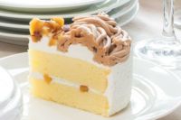 新潟県産コシヒカリを使った米粉のふんわりとしたスポンジで、豆乳クリームとマロンダイスをサンド。